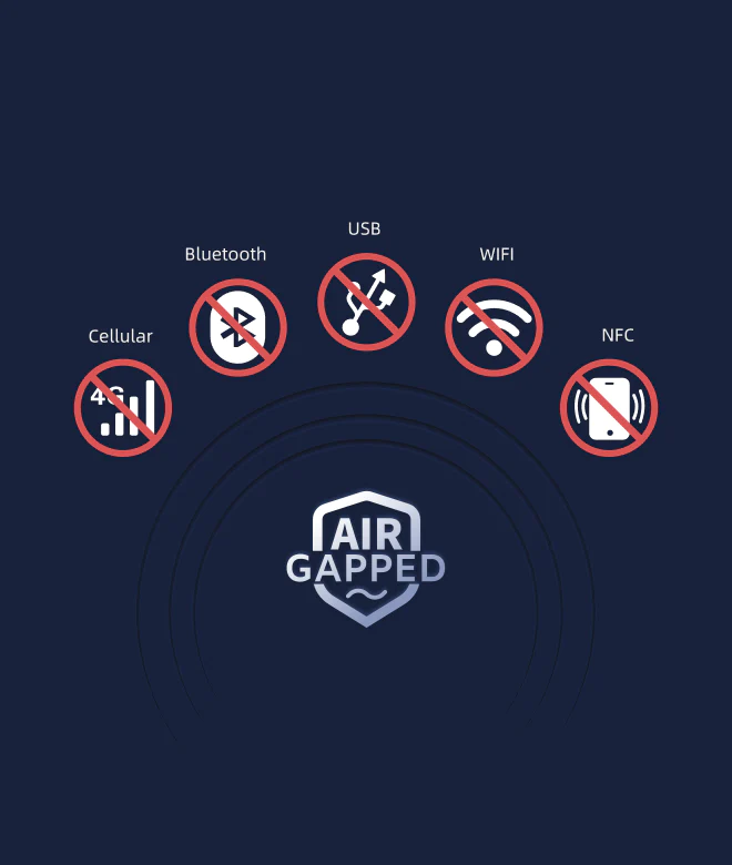 Air-gapped cold wallet is always 100% isolated from the internet. It is fully protected from unauthorized access, cyber hacks, malware, and any online threats.
